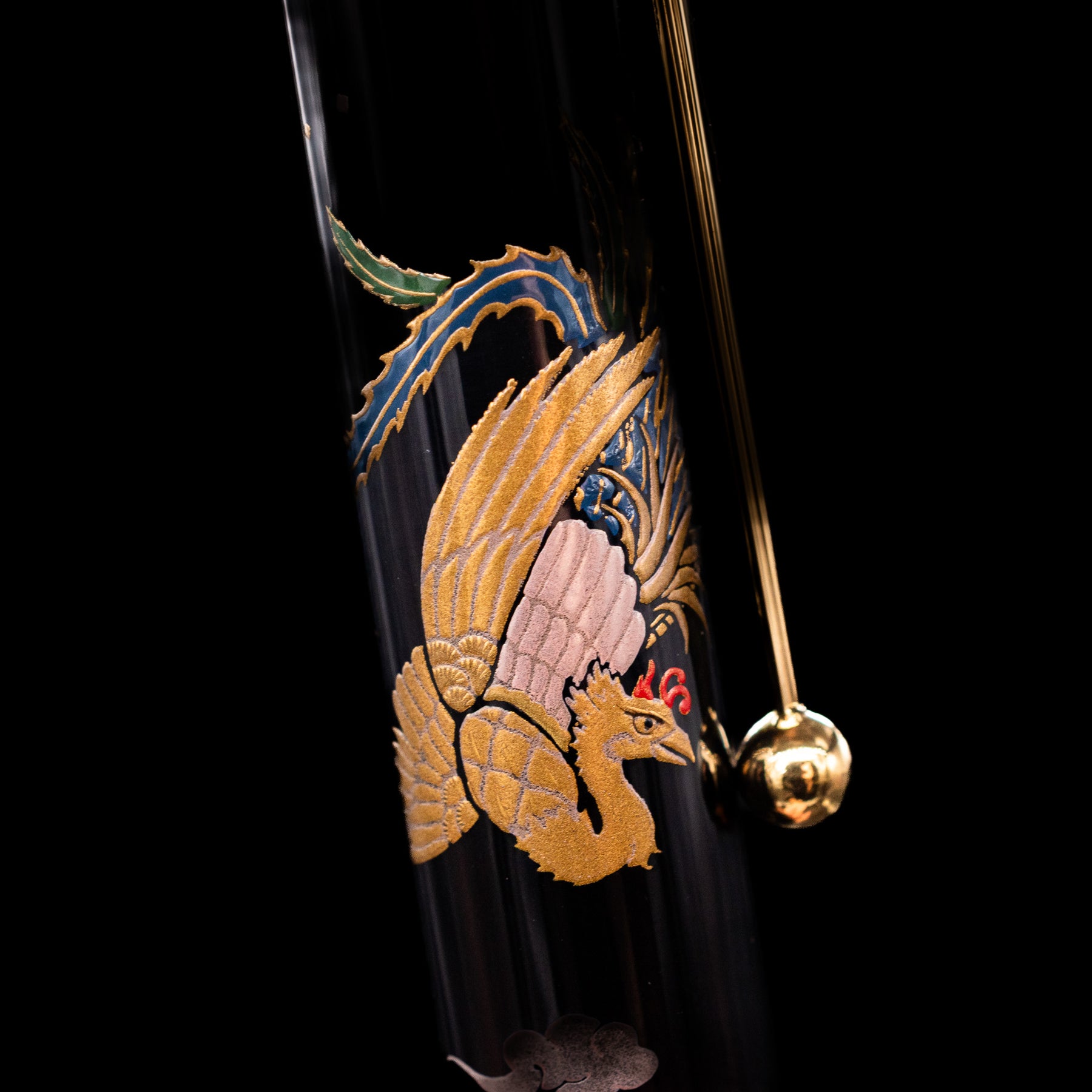Crafted from hand-polished ebonite coated in multiple layers of urushi lacquer, the pen features two radiant phoenixes soaring across the cap and barrel. Using traditional taka-maki-e, hirame-ji, and togidashi maki-e techniques, Yoshida layers gold powder, raden (abalone shell), and richly colored pigments to create shimmering depth and dimensionality. Every feather glows with iridescent life, and each curve is meticulously shaped to follow the movement of the hand-drawn birds.